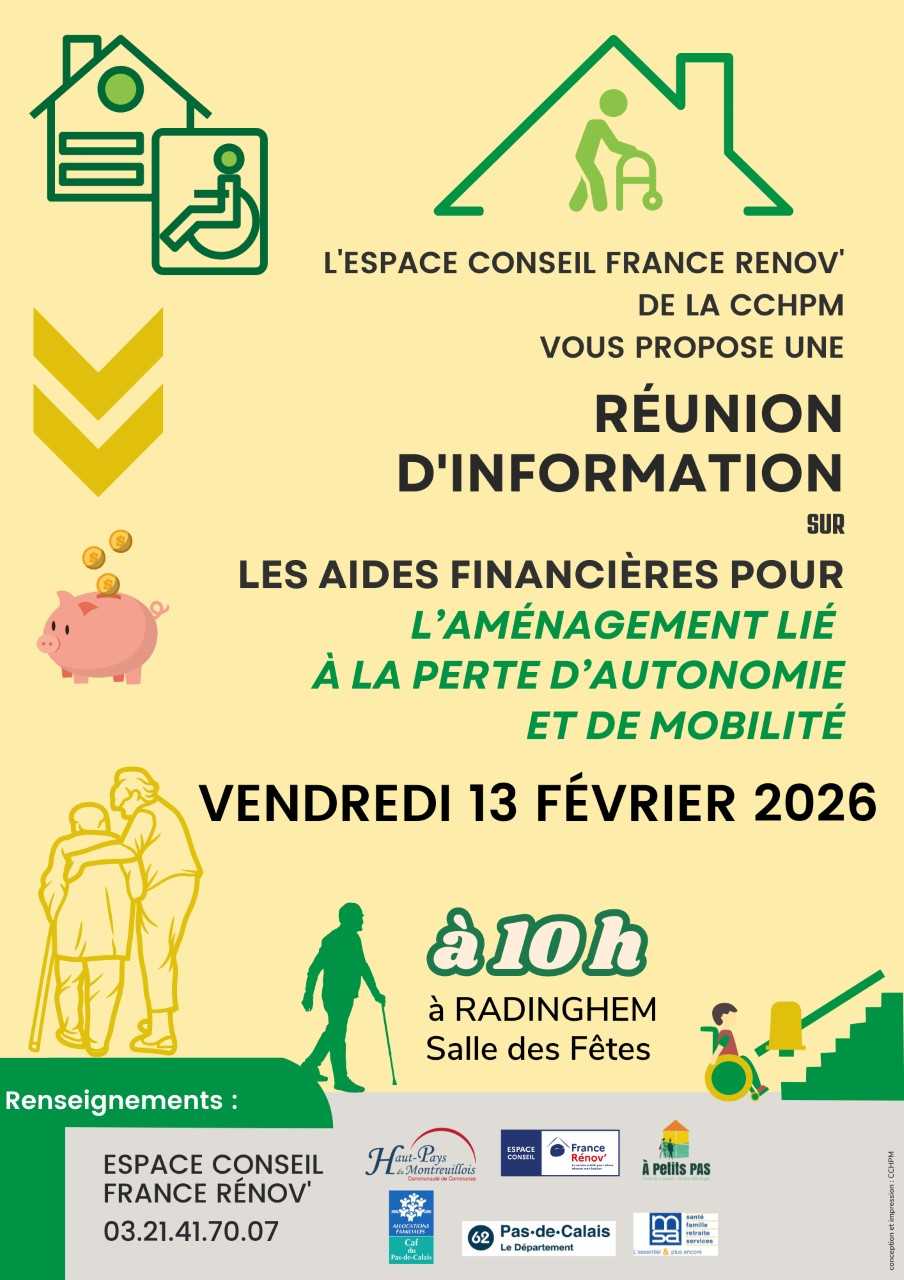 Une nouvelle réunion d’information de l’espace conseil France Rénov’ de la CCHPM aura lieu à 10 h le vendredi 13 février à la salle des fêtes de Radinghem. Elle aura pour sujet les solutions et les aides financières pour faire face à la perte d’autonomie. Quelles aides financières? Quels sont les interlocuteurs à votre disposition? Comment faire les choses dans la bon ordre pour ne rien oublier? Comment éviter les arnaques? Autant de sujets qui seront évoqués par votre conseiller France Rénov’.